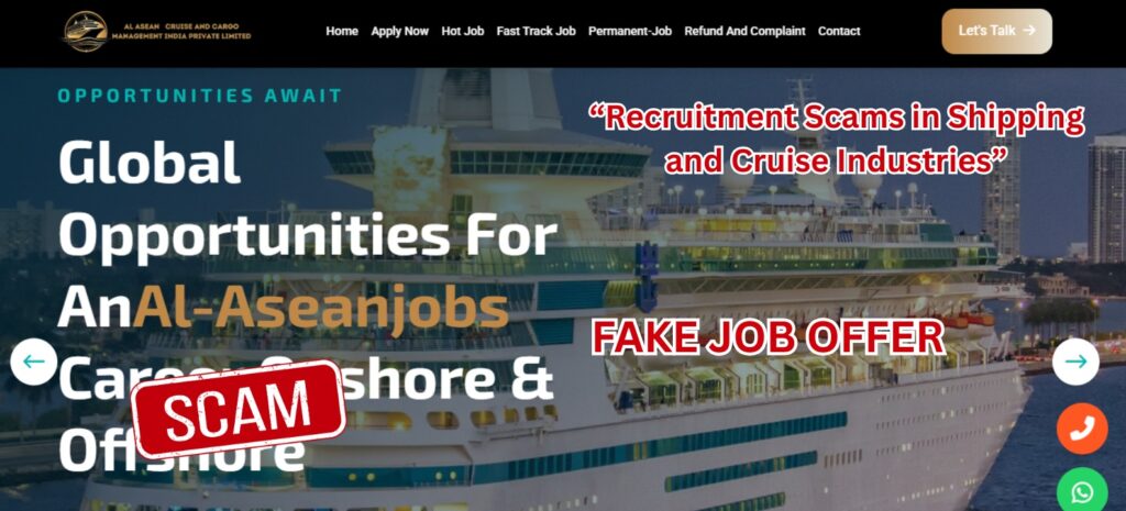 Scammers are aggressively targeting job seekers in the cruise ship and maritime industry with a new wave of fake recruitment schemes. Operating under names like “al-aseanjobs.com”, these fraudsters are exploiting the dreams of hardworking individuals by creating entirely fake companies with one goal: to steal your money.